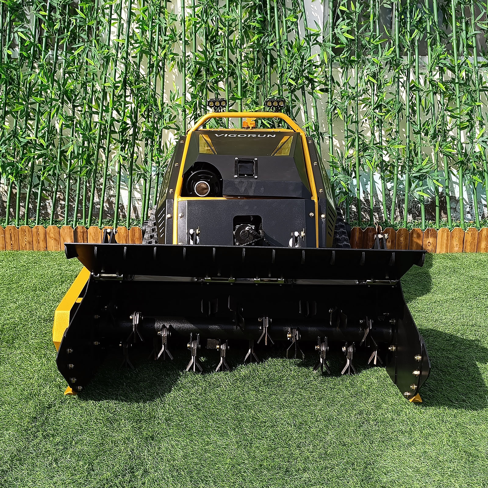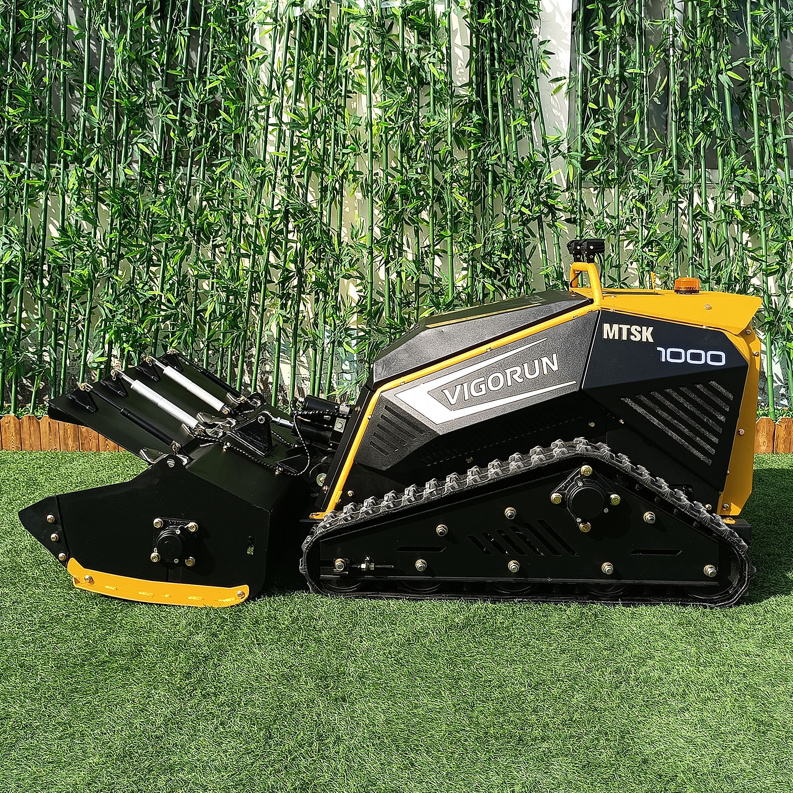 Compared to the standard MTSK1000 remote-controlled flail mower, which is orange, this custom remote-controlled slasher mower features a golden color and LED lights.